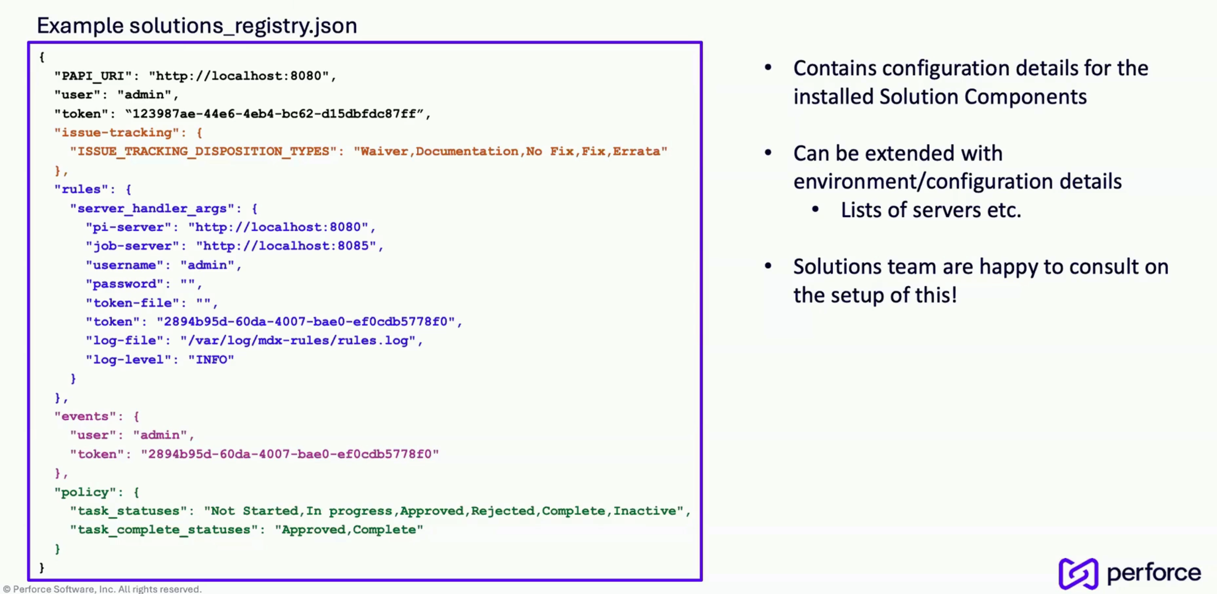 To help our solutions find your custom files, we use a solution registry. This is a JSON file that centralizes configuration details for installed solution components. It tells our packages where to find scripts and settings for features like issue tracking, the rules engine, and event listeners. By centralizing this information, the solutions registry simplifies management and provides a quick overview of your setup for support teams. It can be extended to include server details, IP addresses, and data management settings, creating a single source of truth for your entire IPLM infrastructure.