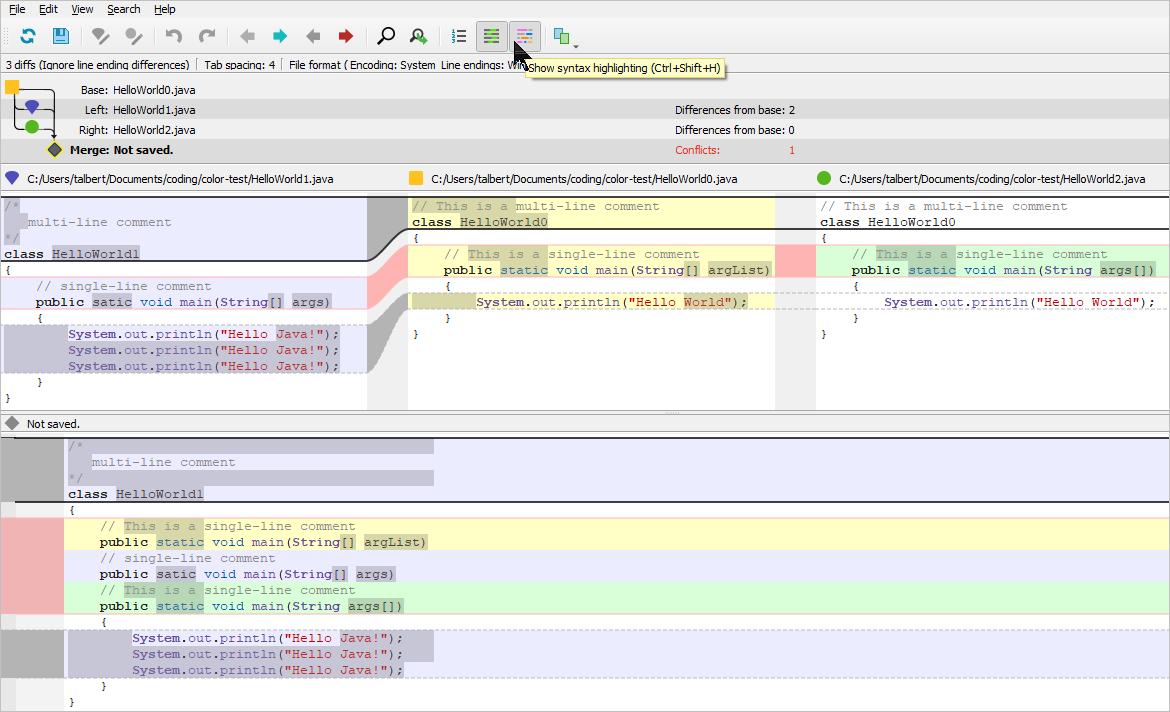 P4Merge shows each file in its own pane, with the base file in the middle. The bottom pane shows the merge results file, a consolidated, merged version of all files.
