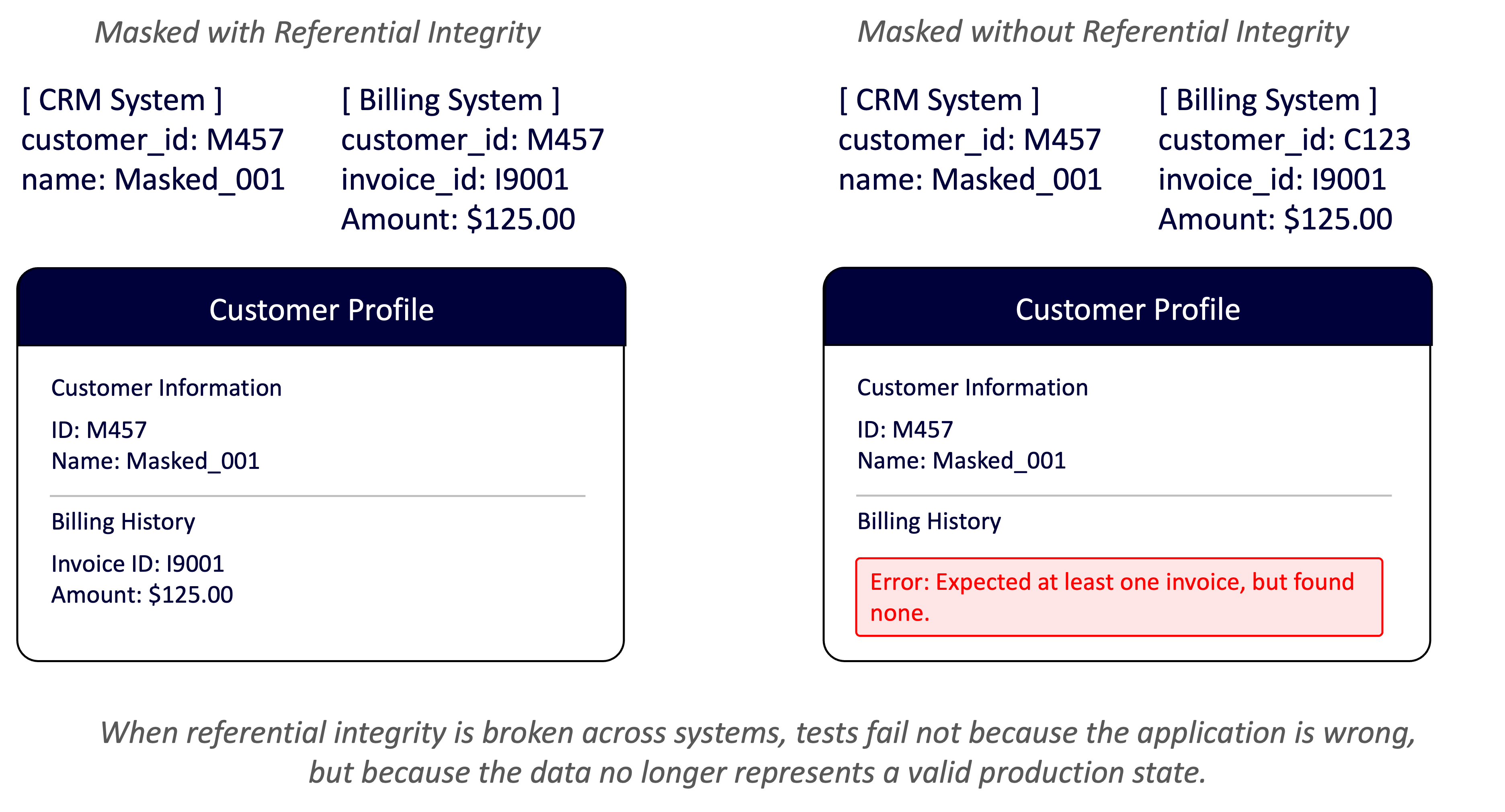 | Example | A retail checkout flow works in tests, but fails when orders can’t resolve customers after masked IDs no longer align. |